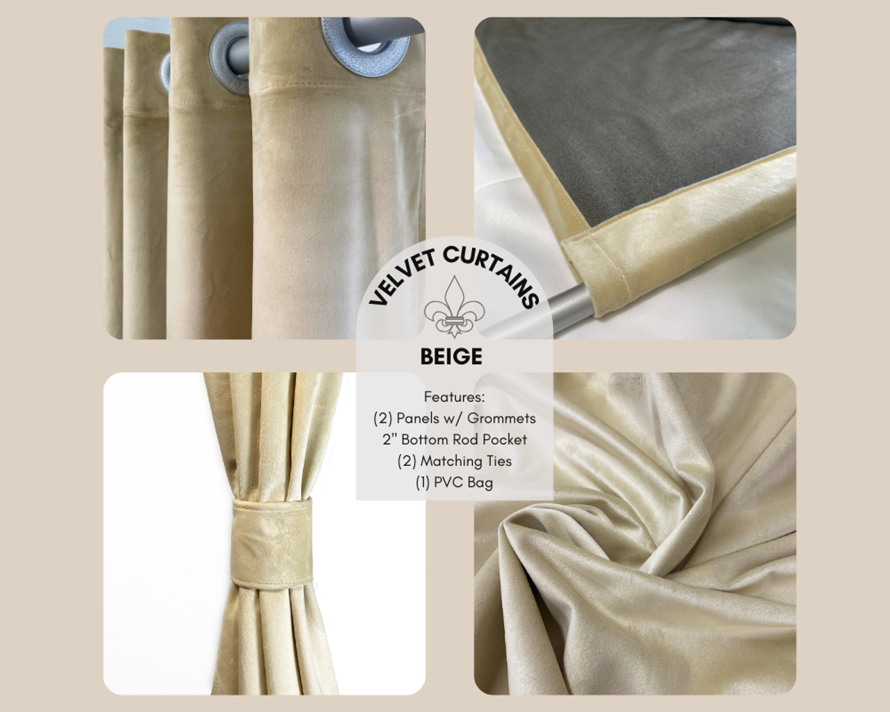 Velvet Curtains in beige are made from high-quality velvet material. These multipurpose curtains can be used to add allure and supplemental beauty for weddings, trade shows, or your home. Our beige velvet curtains include 2 soft drapable curtain panels; each panel measures 52 inches wide x 96 inches long and features 3 inch grommets on top and a 2 inch bottom rod pocket for different styling options. Additionally, velvet curtains provide privacy and are energy efficient. These velvet curtains are sure to exquisitely compliment your décor and create a beautiful setting in any room.