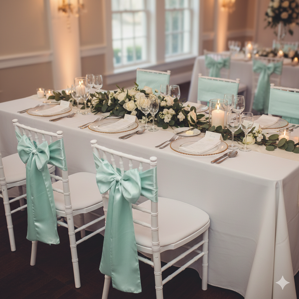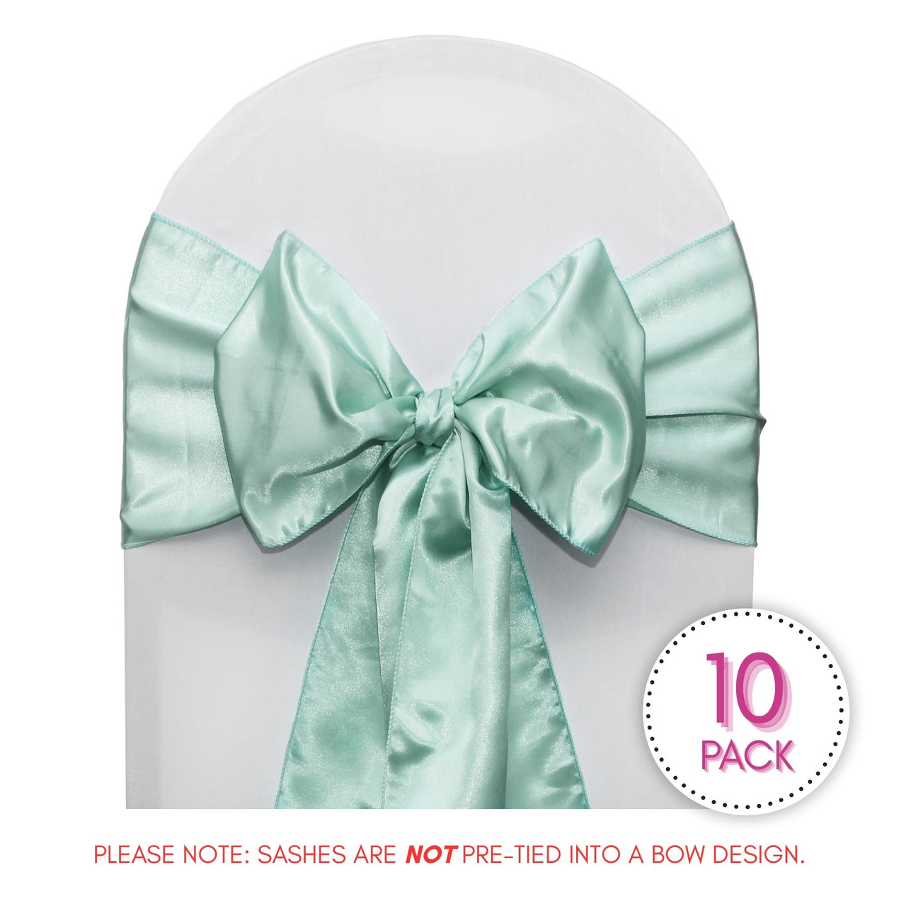Because of their rich, silky-soft appearance, mint green satin chair sashes are undeniably the most popular chair sashes for weddings, special occasions, corporate events and parties. They have been the go-to reception chair accent for wedding planners, event coordinators and fine dining professionals. These 8 x 108 inch mint green chair cover sashes feature the sheen and shimmer aspect that satin table linens are known for. Each mint green satin sash is luxurious to the touch, long enough to aesthetically tie around the chair, and adds the perfect hint of glam and color to your chair covers.