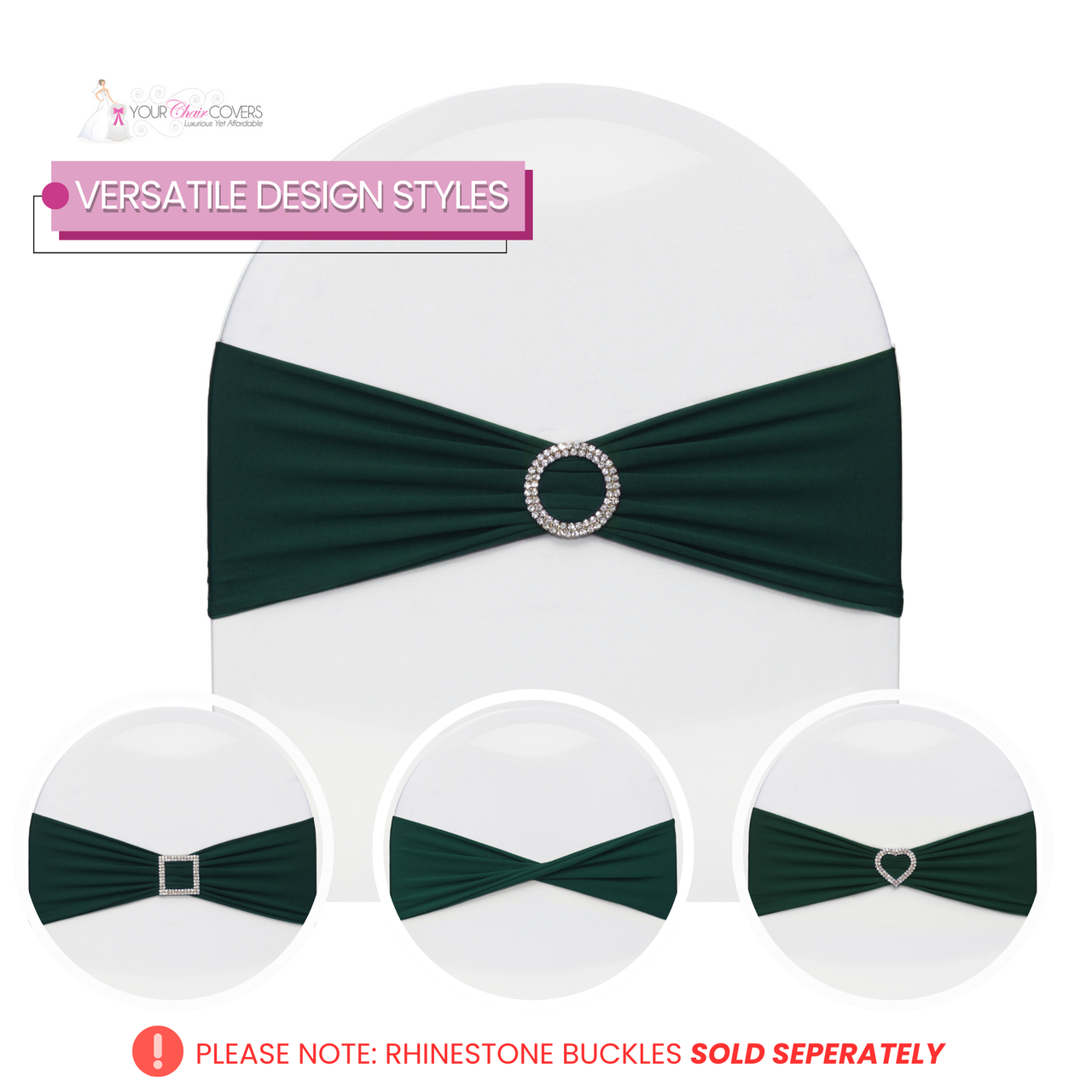 Our Hunter Green stretch spandex chair bands exemplify modern sophistication and affordable elegance. They are designed to complement spandex chair covers in weddings, quinceañera parties, banquet events, corporate affairs and other special events. Hunter Green spandex chair bands from Your Chair Covers are made from high quality four-way stretch spandex material, are durable, do not require ironing and can be laundered countless times. Please note that there are inferior and cheaper versions of this material available in the market and ours is crafted from a hotel and restaurant quality spandex type of material.
